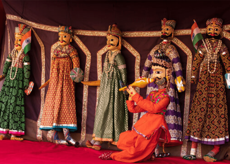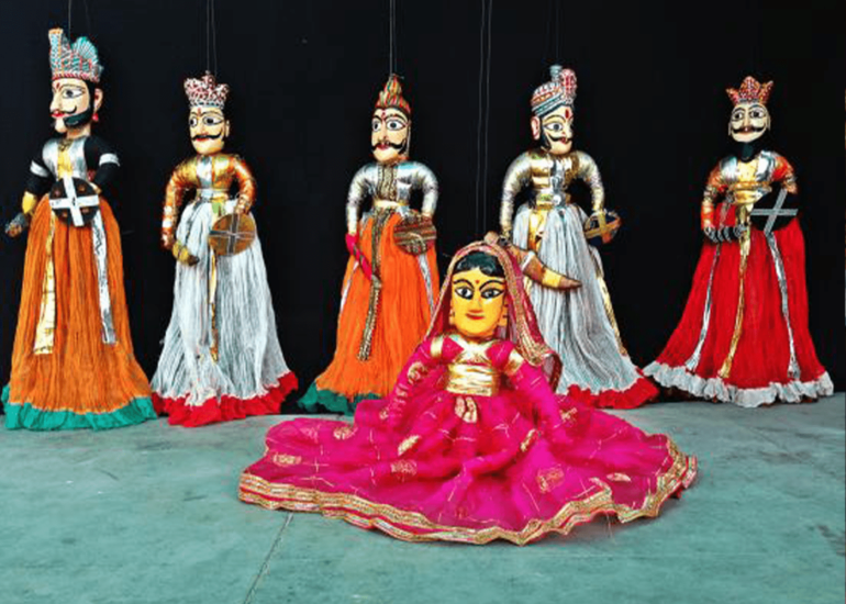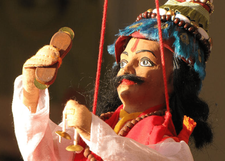 Loud beats on the dholak (a kind of drum) announce the starting of the puppet show. Throughout the show, there is hooting and whistling by the puppeteers.