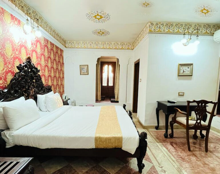 A sumptuously appointed place with a TV armoire, a writing desk, a canopied four poster bed, a card table and a dining table, sofas, ottomans and pouffes and a pair of bronze horses that are offered freshly mown fescue from the palace lawns daily.