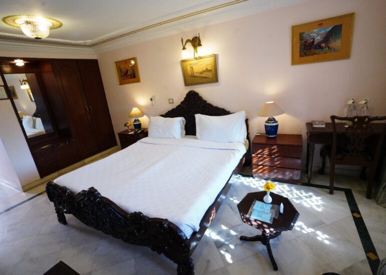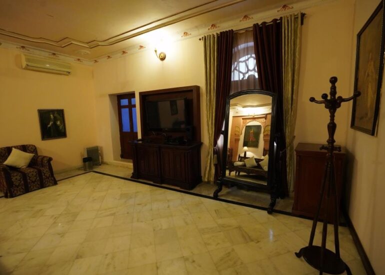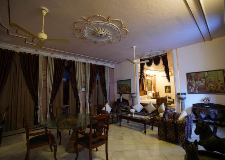 Ganga Mahal You know you’re in a royal bedroom – twin images of Surya the Sun God beam down at you from the Burma teak ceiling, festooned with an intricately carved grid in a resplendent blue. Below, the tone of the place is restrained yet undoubtedly regal. Hunker down in Maharaja Ganga Singh Ji’s brass canopied four-poster bed. Write on his escritoire. Listen to his gramophone, hang your jacket on his coatrack, use his old-school telephone and take your seat in a cosy heirloom jhoola (swing) which still has on its original silk upholstery.